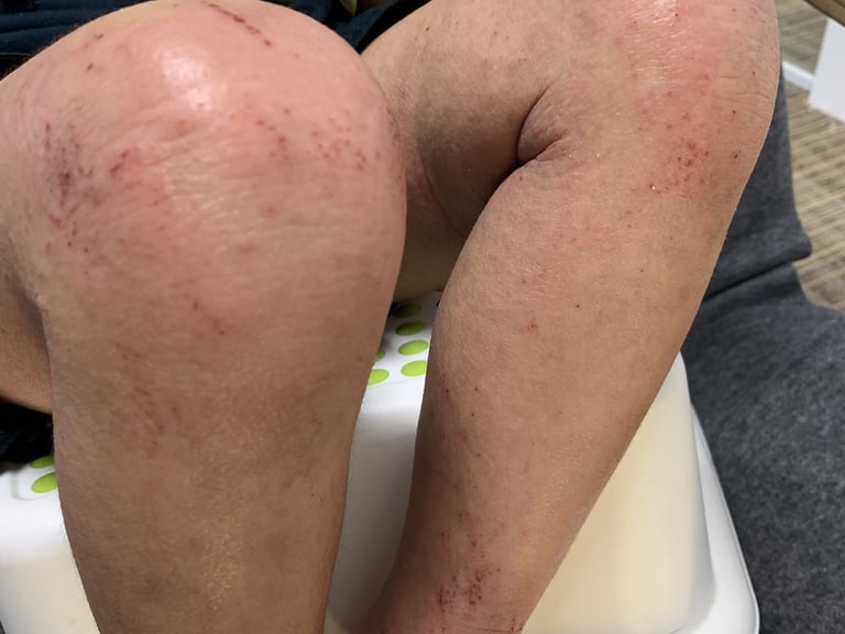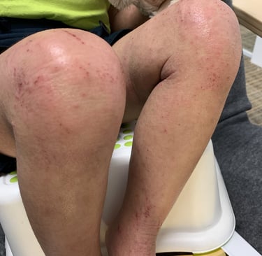 Rashes, dry, flaky, and broken skin from scratching. Waves of intense itch especially at night causing poor sleep. Fatigue, bad mood, anger and frustration.